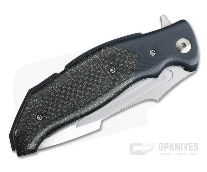 Handle: Robust, polished titanium liners support sensational Silver Lightning Strike Carbon Fiber with blue-grey G10 bolsters which match the dual backspacers that ride proud to the liners. The liner lock has scallops for ease of operation and provides secure lockup and smooth operation.