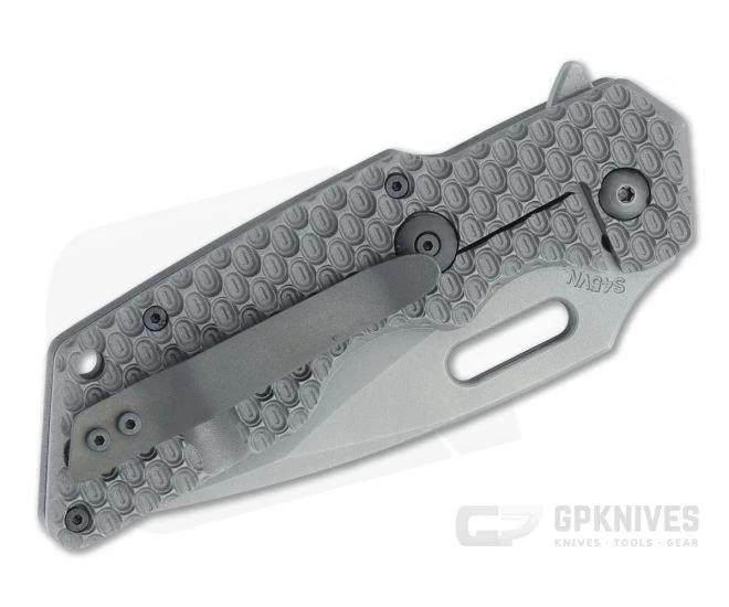 Handle:Â Dual slabs of titanium are contoured and milled with heavy “Gunner Grip” texture and finished in matching blasted gray. The deep ovals of the GG milling deliver unparalleled traction in even the most adverse conditions and will give your pocket edge a nice patina as well. An integral frame lock is smooth and easy to operate and delivers rock solid lockup for safe use. All black hardware completes the construction.