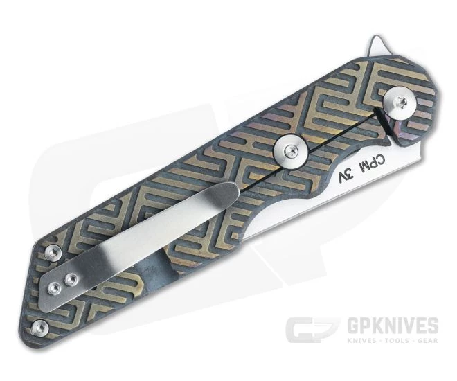 Handle:Â Built in an open back construction, the handle consists of dual slabs of +4.5 mm thick titanium that are chamfered for a comfortable and milled with “Oriental” pattern texturing and two deep finger grooves for a secure grip. Despite the heft, the knife is fast in the hand and comfortable in multiple grip positions. Both scales have the milled pattern and are outfitted with an anodized finish that is orange peel bronze on the high points and mimic a verdigris patina in the channels. An integral frame lock is smooth and easy to operate and delivers rock solid lockup for safe use. Satin finished hardware rounds out this tank-like build.