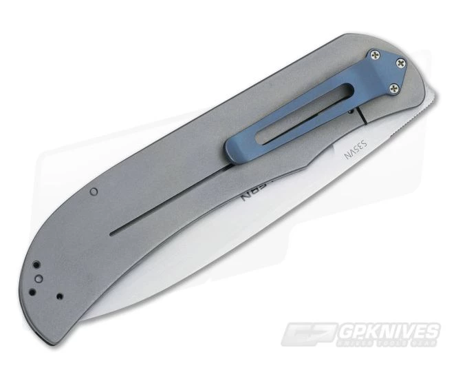 The Blade: Front flipper drop point blade with jimping at thumb ramp that doubles as the flipper. Flat ground of CPM-S35VN with a horizontal satin finish mimicking Skellern/Burger’s custom pieces. Smooth flipping action and razor sharp.