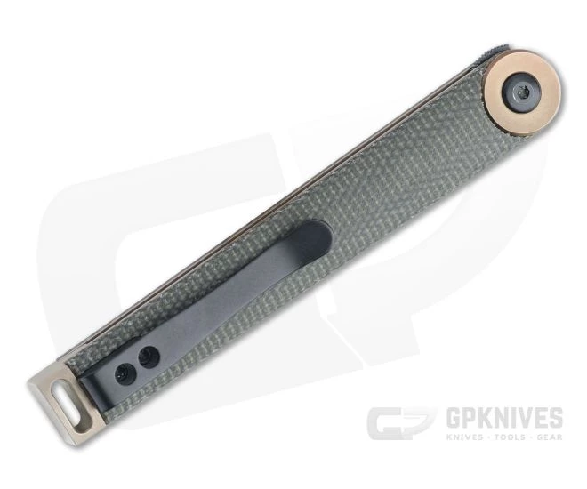 Handle:Â Bronze coated stainless steel decorative pivot, lanyard hole pommel and skeletonized liners complement the rugged green canvas Micarta scales in this slim, minimalist design. Offering a solid grip in the hand, the knife comes equipped with a liner lock mechanism for smooth operation and secure lockup.