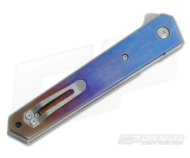 The Handle: Bead-blasted stainless steel liners form the foundation of the handle, including the single liner lock mechanism. Rainbow fade anodized titanium scales have been attached via torx screw construction. Small stainless steel pocket clip attached for tip-up right hand only carry.