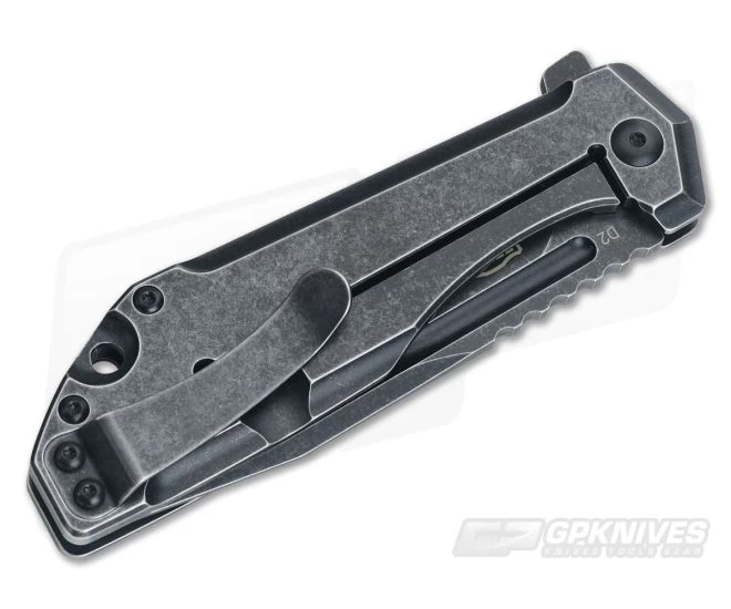 The Blade:Â Formed to a big-bellied, slicing drop point style from hard working D2 tool steel and given a hardcore black stonewashed finish. Over three inches of shaving sharp edge to work with plus small choil and over an inch of jimped thumb ramp to choke up on. Accents include an upper swedge grind peak and a long fuller running down about 90% of both sides. This thing flips like a dream. Especially for its size. It rides on a ball bearings pivot system with spot on detent. D2, Â Mr. Stout’s logo and individual serial number are engraved on the back.
