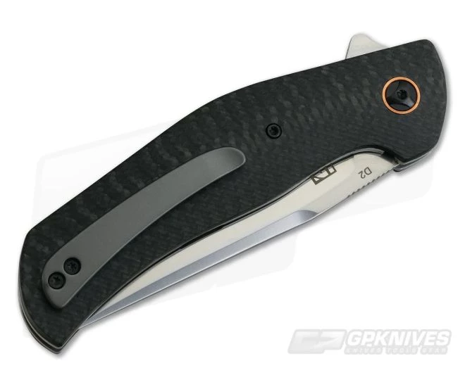 Handle:Â An open back, stainless steel liner lock construction supports some classy, contoured Carbon Fiber handle scales that are comfortable and lightweight. A custom Torx pivot is ringed with a contrasting, copper colored pivot collar ring for a touch of contrast. The liner lock is smooth and solid and the handle design delivers a secure and ergonomic grip for serious use.