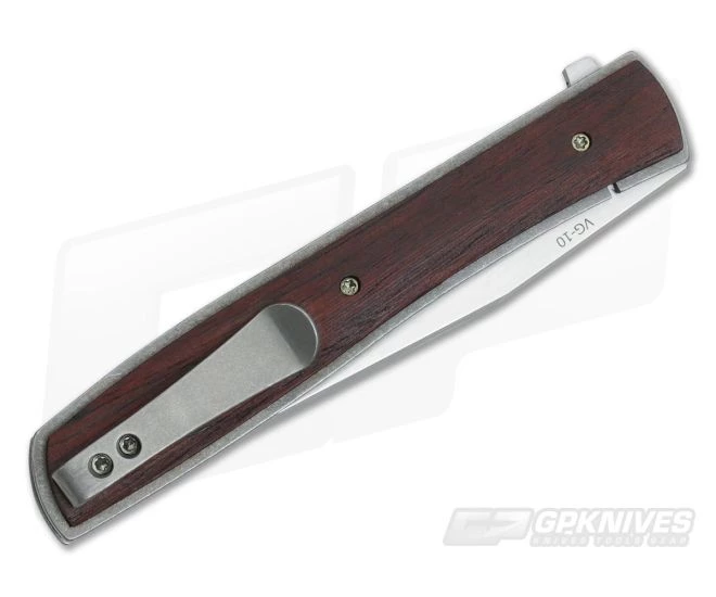 Boker Plus Urban Trapper flipper is one of the slimmest frame locks on the market. Created by innovative knife maker Brad Zinker from Florida to be carried in a suit pocket or dress pants. Super smooth IKBS bearing pivot system reduces blade play yet still allows for quick blade deployment. Classic clip point blade is made from VG-10 steel and is easily opened with the flipper. Lightweight titanium frame comes with handsome cocobolo wood scales for an refined classy look. Includes a titanium deep carry pocket clip for tip up carry. Brand new direct from Boker Knives.