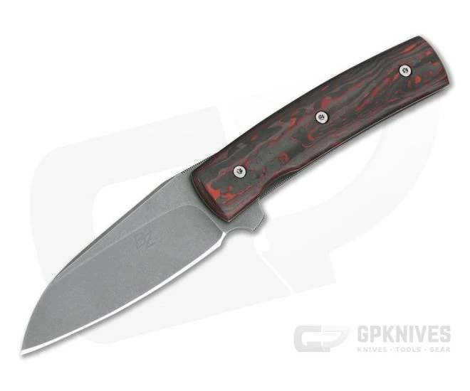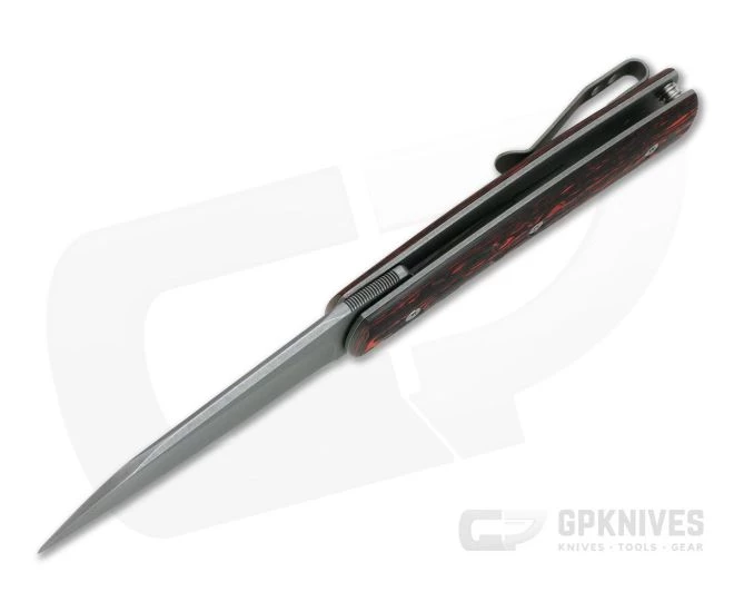 Handle: Two solid titanium liners for the base for this minimalist folder with the open back construction achieved with just one barrel spacer and the blade pivot. The liners have a matching acid stonewashed finish and one forms the liner lock mechanism which is reliable and easy to operate. Striking, Red FatCarbon carbon fiber handle scales are contoured for comfort and secured to the liners with titanium Torx hardware completing this beautiful folder.