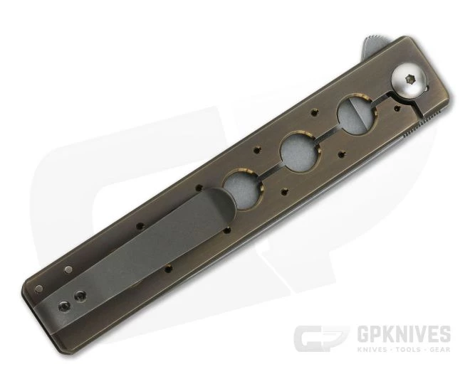 Handle:Â Two solid titanium slabs form the base of this minimalist yet robust folder with the open back construction achieved with two anodized barrel spacers and the blade pivot. Both slabs are bronze anodized and chamfered for comfort with milled holes for traction and weight reduction. The back slab forms the frame lock mechanism which is reliable and easy to operate with titanium Torx hardware completing this beautiful folder.