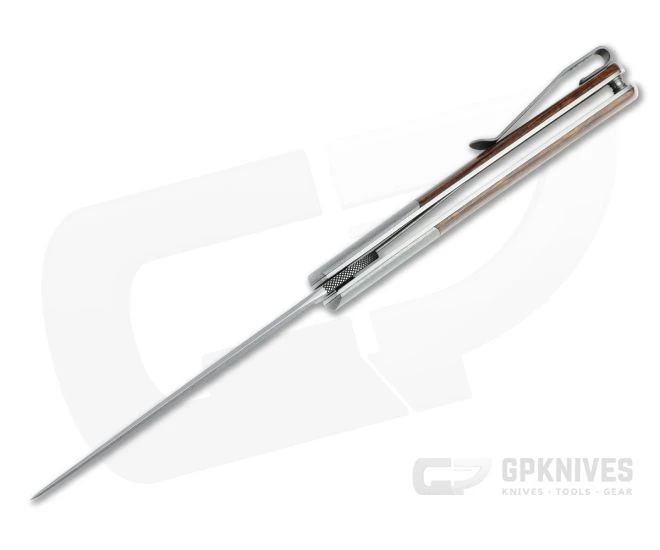 The Custom Brad Zinker Urban Trapper LLF Front Flipper is a blend of his FR Slim and the iconic Trapper pattern with a long, slim profile and ultralight liner lock construction. Made by hand with precision fit and finish and premium materials, this knife is the perfect blend of modern and traditional design. This version comes with a stonewashed CPM-154 drop point blade, jeweled titanium liners and desert ironwood scales with stonewashed titanium bolsters.