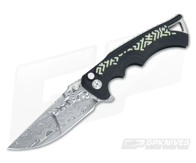 The Blade:Â A compound ground drop point-styled blade means excellent utility cutting with tough endurance. The swirls and clean, shiny pattern of this Damasteel is breathtaking. Brian’s signature appears on the front while it’s outfitted with dual thumb stud or integral flipper deployment. Silky smooth operation thanks to Brian’s ceramic ball bearings STBS (Sealed Thrust Bearings) system.Â