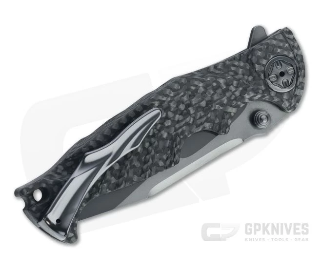 Handle: A solid piece carbon fiber is milled to create the integral handle with fluted milling and finger grooves providing excellent security in the hand. The fluted pattern on the sides gives the knife an organic and futuristic look, while exposing the carbon fiber pattern for added visual appeal. A robust button lock mechanism delivers rock solid lockup and secure operation. The Small Tighe Breaker is slim and easy to carry while still offering a full, four finger grip, and premium details like the DLC coated custom pivot hardware with zirconium collars and end milled channel for lanyard attachment. Includes signature Brian Tighe padded zipper pouch.