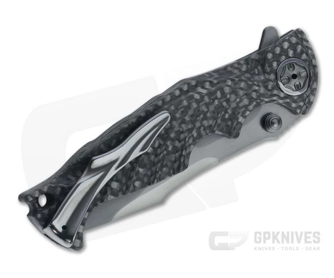 Handle:Â A solid piece carbon fiber is milled to create the integral handle with fluted milling and finger grooves providing excellent security in the hand. The fluted pattern on the sides gives the knife an organic and futuristic look, while exposing the carbon fiber pattern for added visual appeal. A robust button lock mechanism delivers rock solid lockup and secure operation. The Small Tighe Breaker is slim and easy to carry while still offering a full, four finger grip, and premium details like the DLC coated custom pivot hardware with zirconium collars and end milled channel for lanyard attachment. Includes signature Brian Tighe padded zipper pouch.