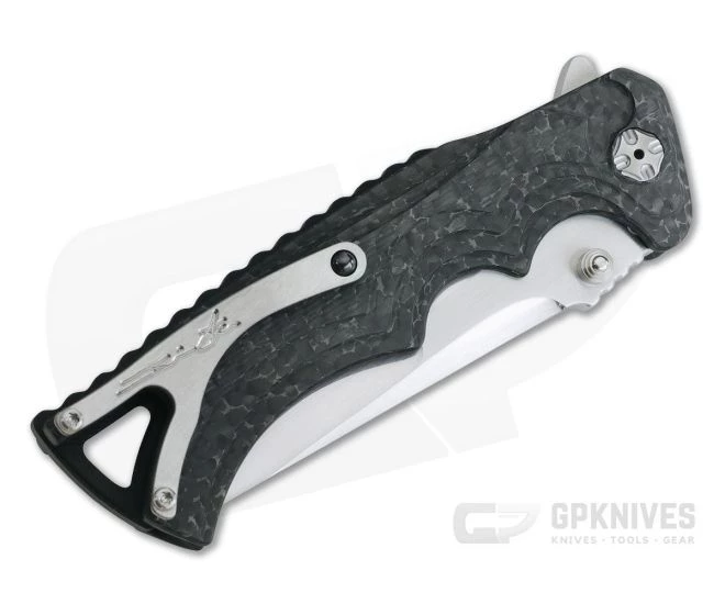 Handle:Â 3D milled and contoured twill carbon fiber is used for the entire handle along with a full length black G10 back spacer. Stepped texturing provides a contoured feel as well as traction in the hand which pairs with the milled finger grooves, pommel swell and index guard for a solid, secure grip. The use of a button lock mechanism means that no liners are needed reducing the weight considerably while maintaining a balanced feel in the hand. A large cut out at the pommel exposes the back spacer which is milled for lanyard attachment. Includes a custom zippered nylon storage pouch.