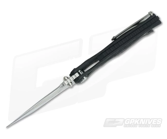 The Handle: 3D machined, marbled carbon fiber is used for the entire handle minus the black G10 backspacer. No liners are needed reducing the weight considerably. The knife is well-balanced with finger grooves that just lock the knife securely into your hand. Stepped milling gives the handles a comfortable, ergonomic feel and visual appeal. A large window cut into the exposed backspacer allow for lanyard attachment while the button lock mechanism deliver secure, reliable operation.