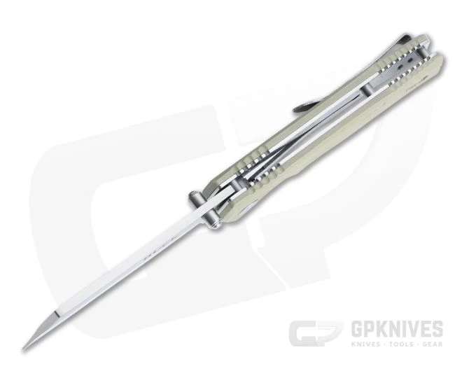 Handle:Â Stainless steel liners and barrel spacers form the open back construction supporting textured and chamfered tan G10 scales for lightweight durability and a secure grip in hand. The scales have strategic jimping and subtle finger grooves for a solid grip while the liner lock offers smooth operation and secure lock up for safe use.