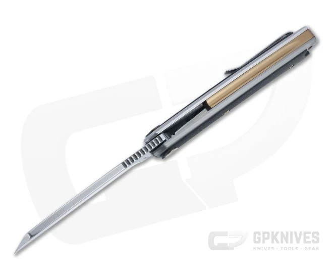 Handle: Comprised of a gray anodized aluminum front slab and stonewashed steel frame, the streamlined ergonomic handle is comfortable and secure with added traction from the G10 on lays. A full length back spacer comes coated with antique bronze titanium, matching the hardware and lanyard tube. Lock operation is smooth and solid for safe use.