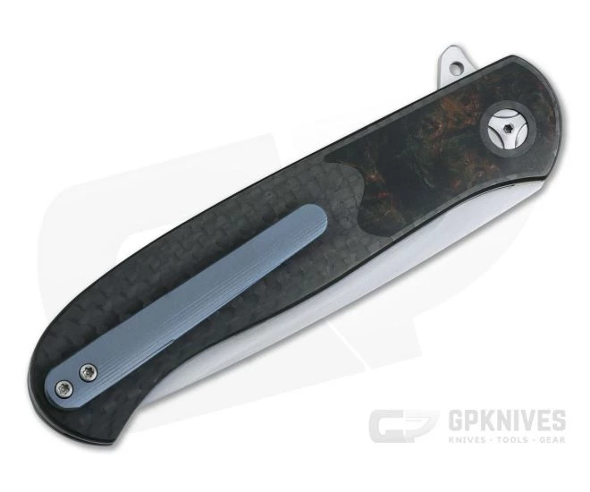 Handle:Â The blue anodized titanium liner construction supports elegant Low-Void Aerospace or LVA Carbon Fiber Scales with Dyed Maple Burl wood inlaid ‘bolsters’. Trevor’s design has clean lines and a great in-hand feel with precision fit and finish. One liner acts as the lock mechanism for secure use. A full length carbon fiber back spacer and titanium hardware round out the construction.