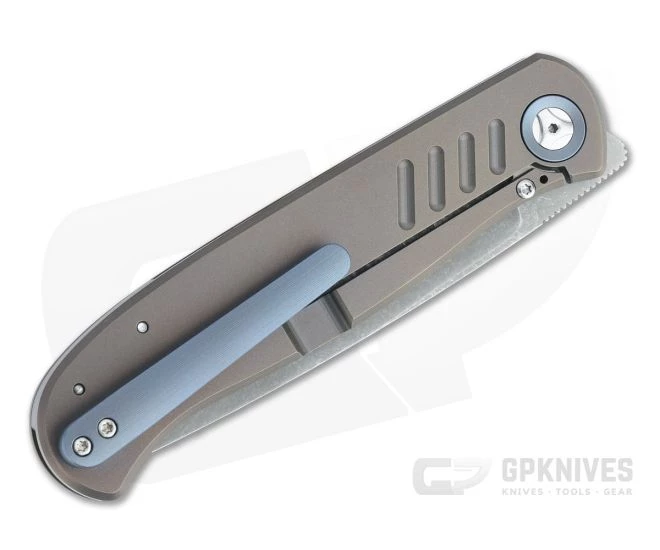 Handle: Matte blasted and bronze anodized, the streamlined titanium handle is chamfered for a comfortable, secure grip that is easy to carry. Blue anodized pivot collars, back spacer and pocket clip offer a subtle color contrast while milled grooves enhance traction. The robust integral titanium Slab Frame Lock is equipped with a hardened steel lock face insert for smooth operation, rock solid lockup and secure operation for the life of the knife. Ships in a zippered nylon pouch with Certificate of Authenticity.