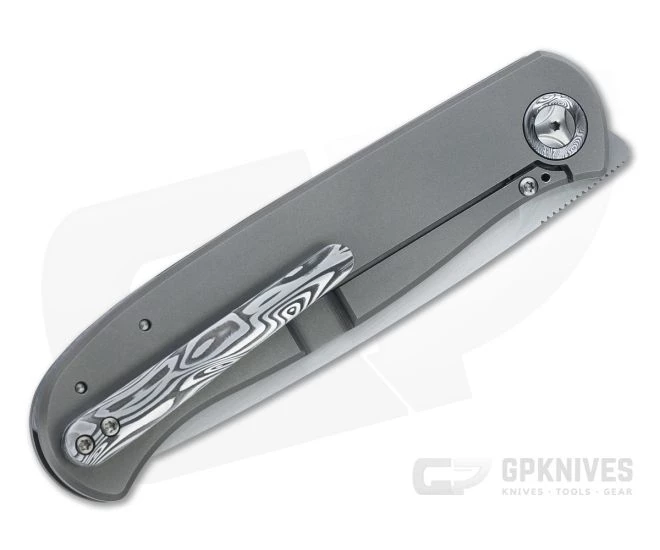Handle: Matte blasted gray, the streamlined titanium handle is chamfered for a comfortable, secure grip that is easy to carry. Damasteel pivot collars, back spacer, pocket clip and handle inlay offer a stunning upgrade for eye-catching style. The robust integral titanium Slab Frame Lock is equipped with a hardened steel lock face insert for smooth operation, rock solid lockup and secure operation for the life of the knife. Ships in a zippered nylon pouch with Certificate of Authenticity.