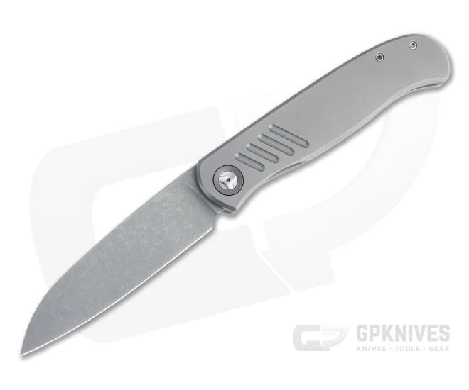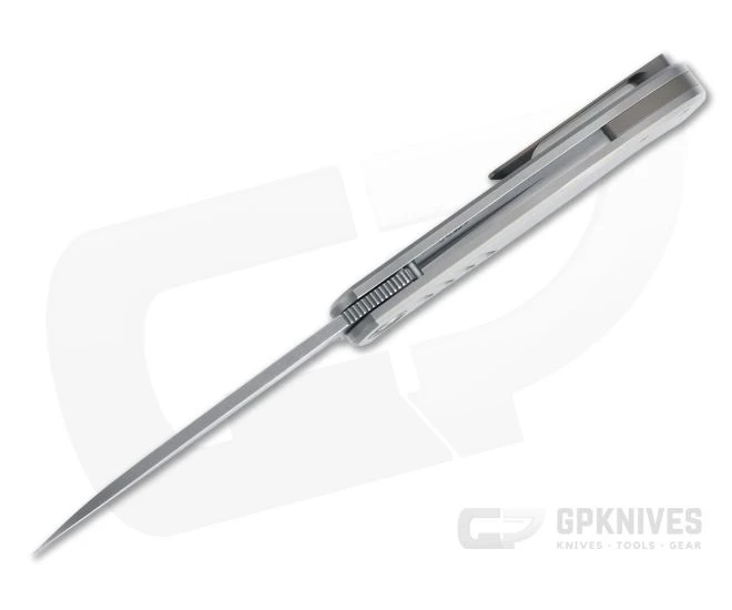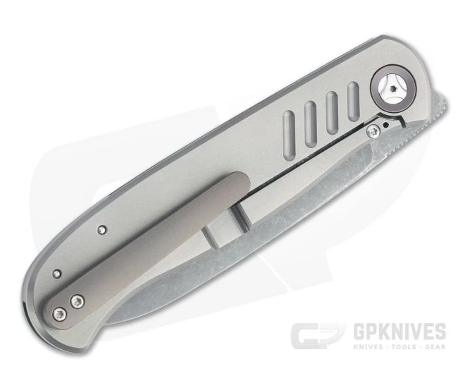 Handle: Blasted matte gray, the streamlined titanium handle is chamfered for a comfortable, secure grip that is easy to carry. Bronze anodized pivot collars, back spacer and pocket clip offer a subtle color contrast while milled grooves enhance traction. The robust integral titanium Slab Frame Lock is equipped with a hardened steel lock face insert for smooth operation, rock solid lockup and secure operation for the life of the knife. Ships in a zippered nylon pouch with Certificate of Authenticity.