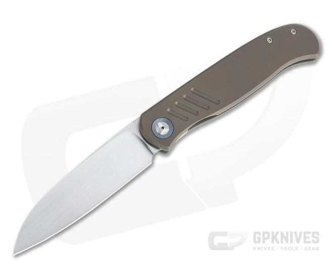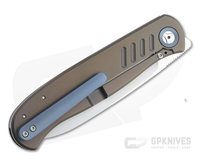 Handle: Matte blasted and bronze anodized, the streamlined titanium handle is chamfered for a comfortable, secure grip that is easy to carry. Blue anodized pivot collars, back spacer and pocket clip offer a subtle color contrast while milled grooves enhance traction. The robust integral titanium Slab Frame Lock is equipped with a hardened steel lock face insert for smooth operation, rock solid lockup and secure operation for the life of the knife. Ships in a zippered nylon pouch with Certificate of Authenticity.