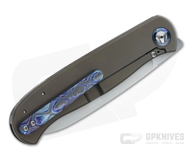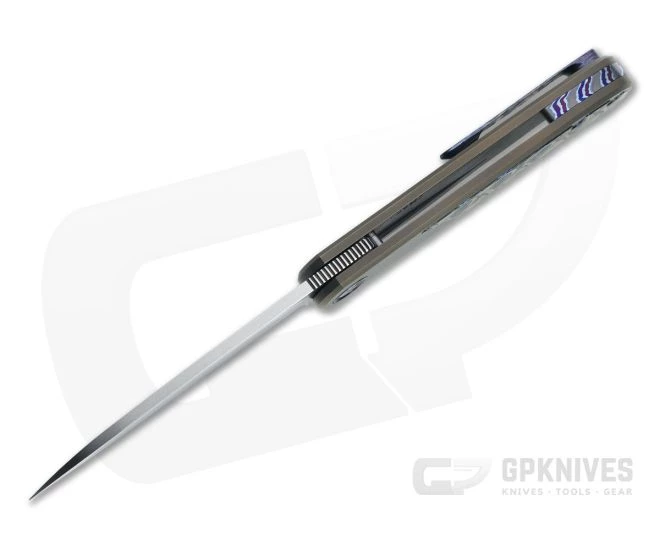 Handle: Matte blasted and anodized bronze, the streamlined titanium handle is chamfered for a comfortable, secure grip that is easy to carry. Black TiMascus pivot collars, back spacer, pocket clip and handle inlay offer a stunning upgrade for eye-catching style. The robust integral titanium Slab Frame Lock is equipped with a hardened steel lock face insert for smooth operation, rock solid lockup and secure operation for the life of the knife. Ships in a zippered nylon pouch with Certificate of Authenticity.