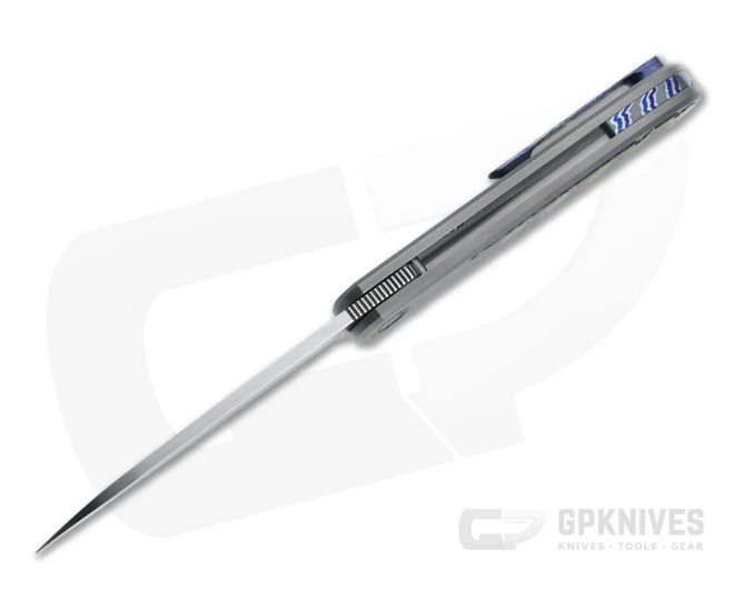 Handle: Matte blasted gray, the streamlined titanium handle is chamfered for a comfortable, secure grip that is easy to carry. Black TiMascus pivot collars, back spacer, pocket clip and handle inlay offer a stunning upgrade for eye-catching style. The robust integral titanium Slab Frame Lock is equipped with a hardened steel lock face insert for smooth operation, rock solid lockup and secure operation for the life of the knife. Ships in a zippered nylon pouch with Certificate of Authenticity.