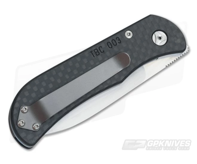 The Handle: The blue anodized, single titanium liner construction supports finely finished Carbon Fiber Scales and a black with red pinstripe G10 back spacer. The single liner doubles as the liner lock mechanism for secure use. The lock side scale is marked “TBC 003”. A matte gray titanium pocket clip is set up for tip-up, right hand carry only.