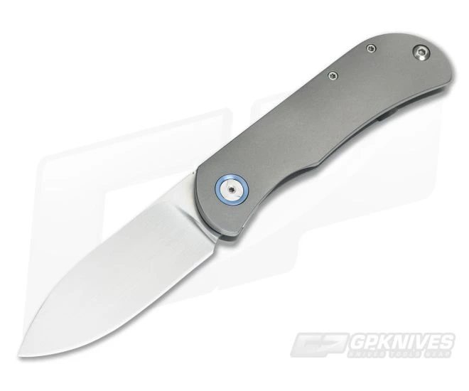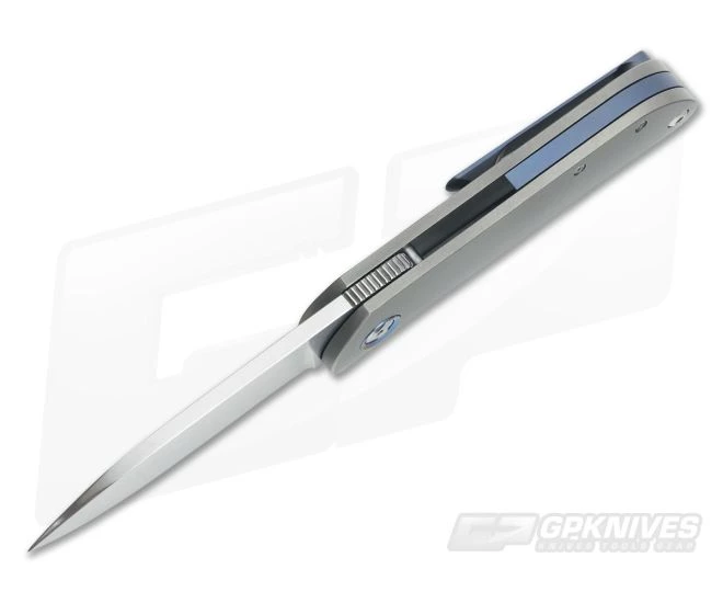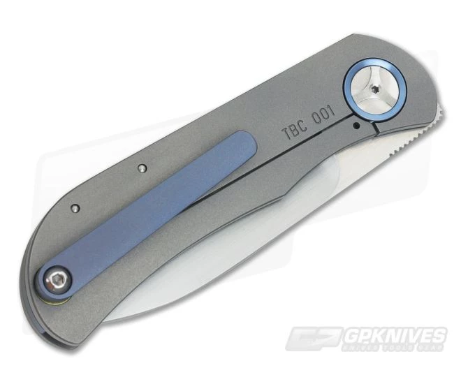 The Handle:Â Full titanium construction makes the CFL a more rugged folder but the blue anodized pivot collars, floating back spacer and pocket clip add a touch of color giving it a classy look. The handle slabs are lightly contoured and are bead blast matte gray finished. A 3D machined, blue anodized titanium pocket clip is set up for tip-up, right hand carry only. A titanium frame lock delivers smooth, solid, and secure operation. “TBC 001” is stamped just above the lock bar cutout.Â