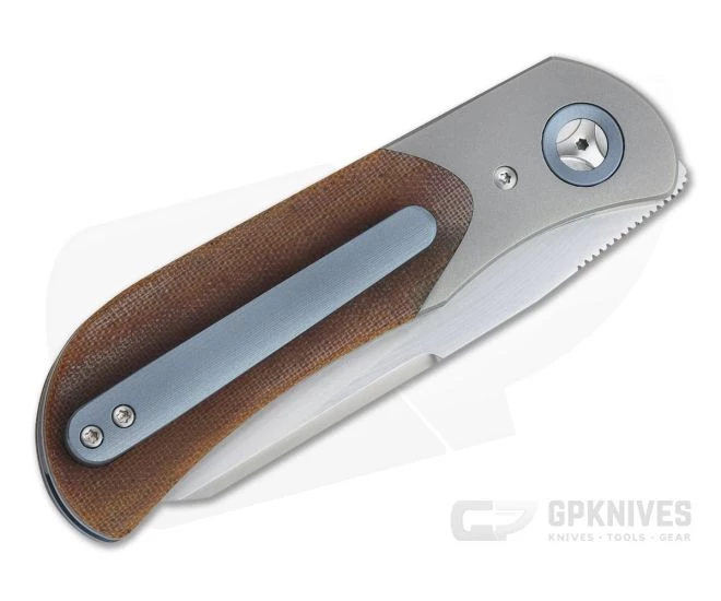 Handle:Â Blue anodized, dual titanium liner construction supports the Micarta scales that are flush fit with matte gray blasted titanium bolsters. Smooth, unpolished Micarta offers traction without being aggressive while blue anodized collars set off the custom pivot hardware. One liner forms the simple, robust liner lock mechanism delivering secure use and ease of operation.