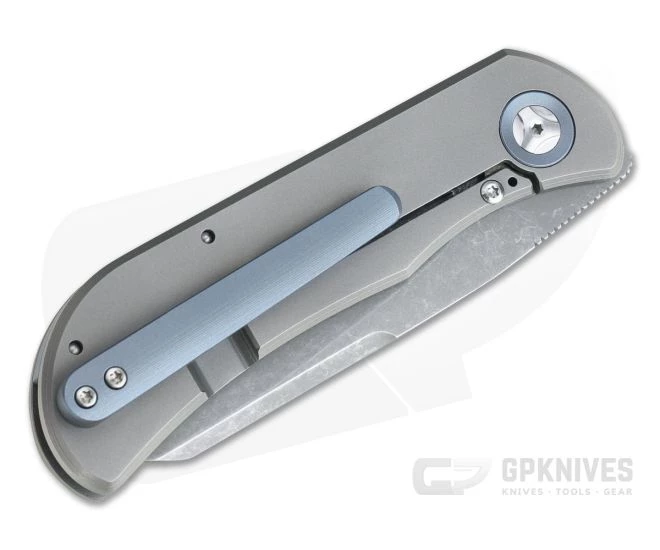Handle: The rugged integral titanium Slab Frame Lock is equipped with a hardened steel lock face insert for smooth operation, rock solid lockup and secure operation for the life of the knife. Blue anodized pivot collars, floating back spacer and pocket clip add a touch of color giving it a classy look. The handle slabs are lightly contoured and are bead blasted for a matte gray finish and subtle texture. The front is inlaid with handsome natural Micarta for visual appeal. Ships in a zippered nylon pouch.