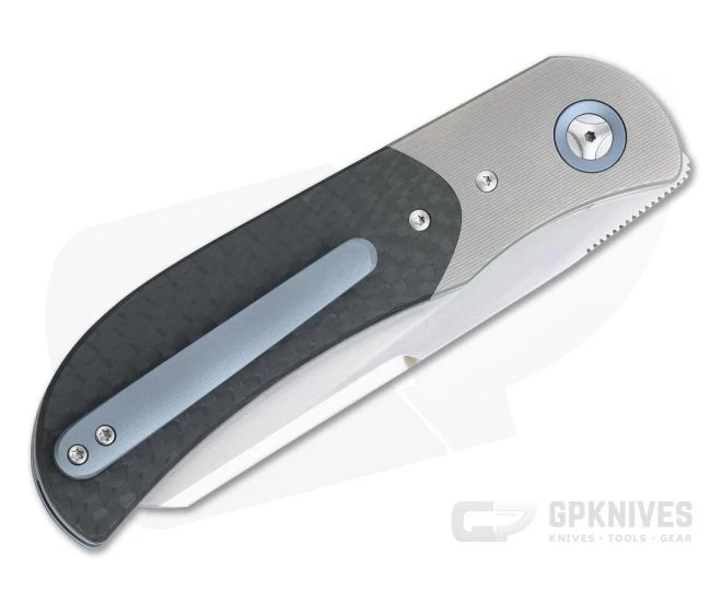 Handle:Â Robust, blue anodized titanium liners support the handsome Carbon Fiber scales and flush fit, machine grooved titanium bolsters for striking, modern look and solid feel in the hand. Blue anodized pivot collars, custom pivot hardware and a solid carbon fiber back spacer are fine custom touches. The rear liner forms the locking mechanism which is smooth and easy to operate delivering rocks solid lockup. Ships in a zippered nylon pouch with Certificate of Authenticity.