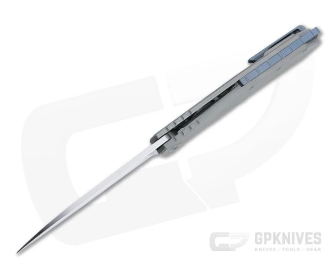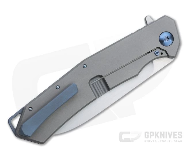 Handle: Blasted matte gray titanium slabs are internally milled for weight reduction forming a slim yet substantial handle. The ergonomic design is enhanced by chamfered edges for comfort with a deep index choil and jimping near the pivot. The integral frame lock comes with a hardened steel lock face for smooth operation, solid lockup and secure operation for the life of the knife. Custom blue anodized hardware, back spacer and clip add a pop of color. Ships in a zippered nylon pouch with Certificate of Authenticity.
