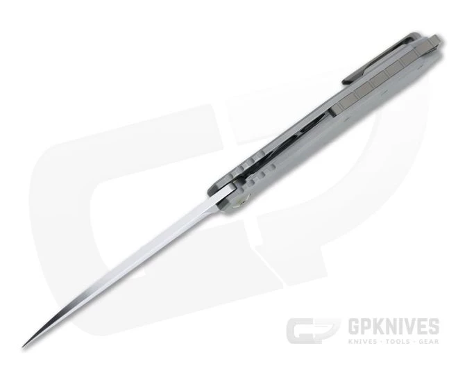 Handle: Blasted matte gray titanium slabs are internally milled for weight reduction forming a slim yet substantial handle. The ergonomic design is enhanced by chamfered edges for comfort with a deep index choil and jimping near the pivot. The integral frame lock comes with a hardened steel lock face for smooth operation, solid lockup and secure operation for the life of the knife. Custom gold anodized hardware, back spacer and clip add a pop of color. Ships in a zippered nylon pouch with Certificate of Authenticity.