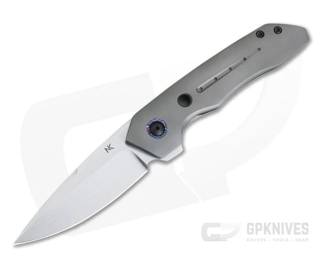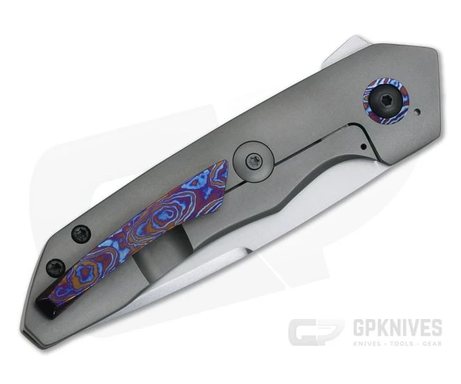The Chad Nell Custom Gent is a clean and utilitarian design that is well adapted to dress and every day carry. This is a robust, titanium frame lock flipper that doesn’t sacrifice function for style and has both in spades. This version has a hand rubbed satin finished, AEB-L stainless steel blade, milled and contoured titanium handles and Evil Eye pattern Timascus pocket clip, backspacer and pivot collar rings.