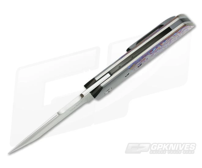 The Handle:Â Liners built with wonderful matte grey titanium gets a light sheer to it via the orange peel method. This finishing adds a most welcomed texturing and appearance throughout. Dark and mysterious Zirconium bolsters accent the insane star of the show…Lava Lamp Black TiMascus scales. They have a bolster-matching background with wildly blue and purple lava flow. The Hardline features polished Torx hardware, Zirconium back spacer and tip up pocket clip.