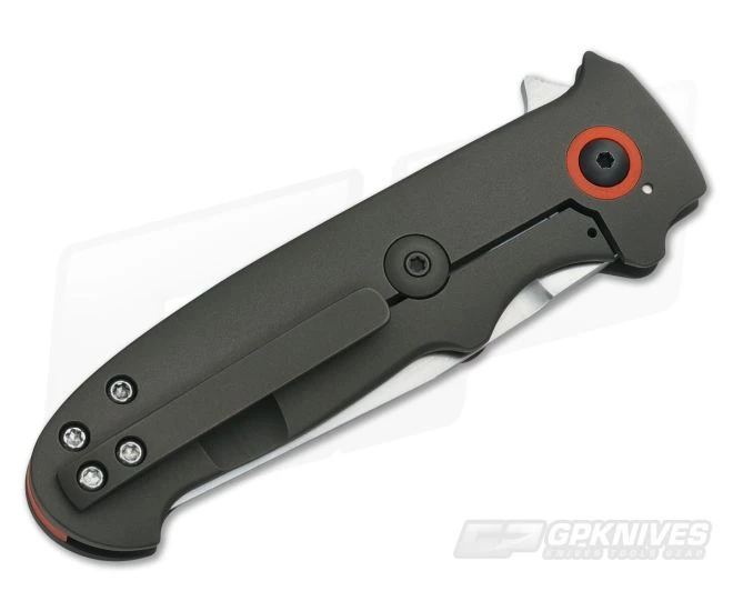 The Handle:Â Full titanium handle scales give this folder a solid feel while contouring and a pronounced forefinger groove offer a comfortable grip. Â The back titanium slab forms a reliable frame lock also featuring a lockbar stabilizer to prevent overextension of the lockbar. Â Lightening holes, orange G10 pivot ring and partial backspacer accent the subdued bead-blasted body. Â