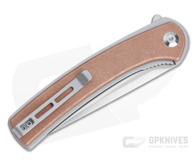 Handle:Â Blasted, matte gray stainless steel liners support hearty stonewashed copper handle scales with the liners riding proud to deliver a more contoured feel in the hand. Simple and neutral in design, the sweeping handles are comfortable and secure with solid ergonomics in multiple grip positions. The stainless steel liner lock is smooth, robust and reliable offering simple and intuitive operation with jimping for enhanced traction. An inline pin is provided for lanyard attachment at the pommel end.