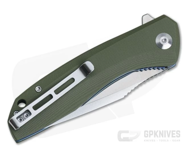 Handle: Solid Blue colored stainless steel liners support handsome, contoured Green G10 handle scales for an ergonomic grip in the hand while the peel-ply texture offers plenty of traction for security. The gentle swell toward the pommel end delivers plenty of security and control for any task. The liner lock mechanism is smooth, secure and intuitive with jimping for reliable operation.