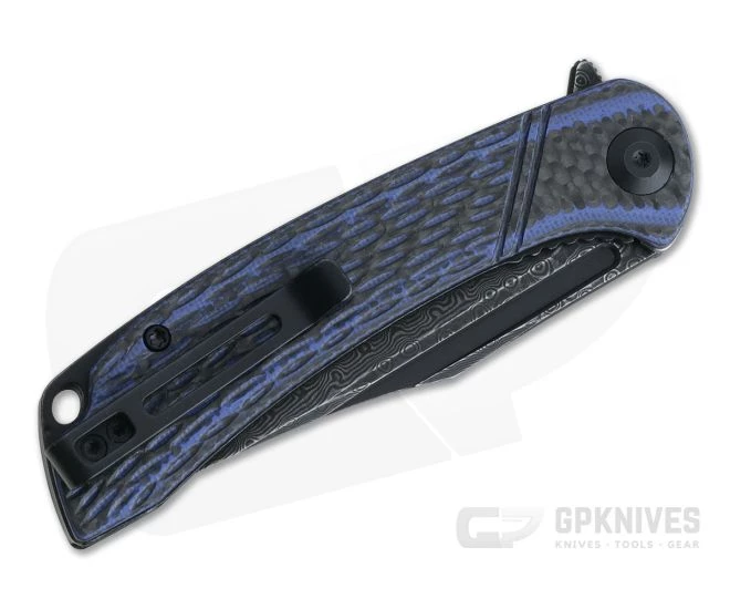 Handle: Skeletonized black stainless steel liners support the ergonomically contoured layered blue G10/carbon fiber scales which have been milled with a faux bolster and jigged texture for a timeless look and enhanced traction in hand. The layered handle material paired with the smooth bolster and textured scale section offer a stunning look with modern, lightweight performance. One liner forms the liner lock mechanism offering smooth, reliable operation and solid lockup with scallops to aid in disengagement. Exposed liners at the pommel are milled with a generous hole for lanyard attachment while a partial G10 back spacer and black Torx hardware complete the construction.