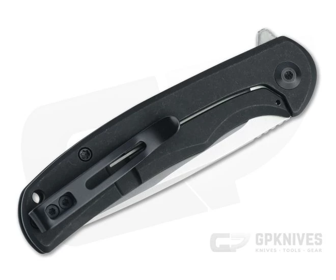 Handle: Dual slabs of chamfered, black coated stainless steel form the simple and robust handle with two barrel spacers completing the open back construction. The back scale is cut to form the integral frame lock which is smooth, solid and reliable in operation for safe use. The rearmost barrel spacer allow for inline lanyard attachment.