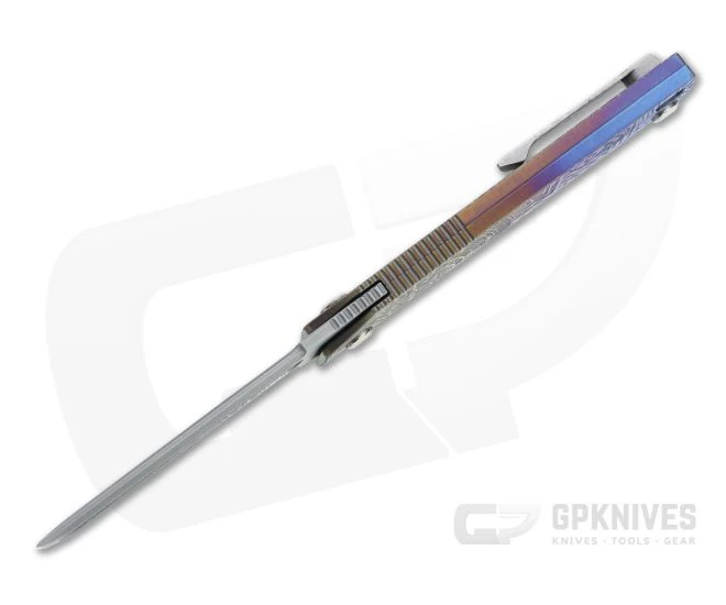 Handle: Joined in a faux integral construction, the contoured titanium handle is clean, comfortable and rock solid with an easy to operate jimped integral frame lock. Additional frame jimping and the engraved Aztec calendar graphics gives solid traction for a secure grip. A multicolor anodization pairs with the engraving for a standout look. The large handle offers a full grip for most users. Includes padded hard plastic case for transport and storage.