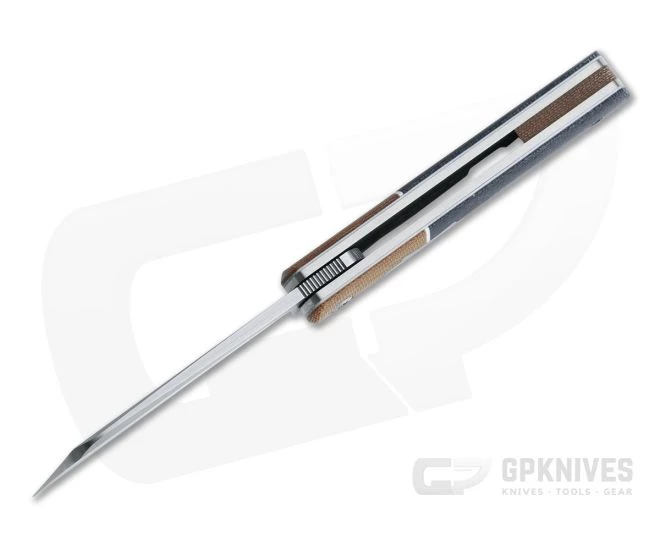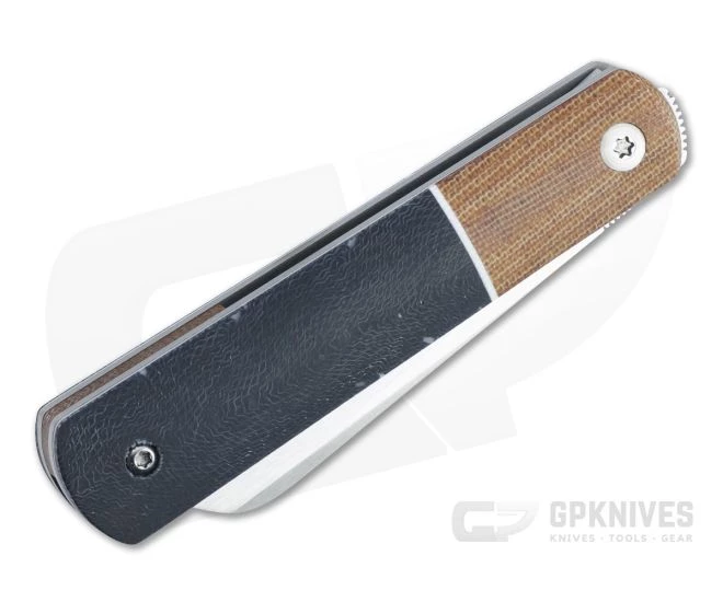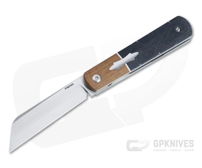 Handle:Â Thick satin finished titanium liners support handles of durable Micarta, natural canvas for the bolsters separated by white liners from the handsome blue crosscut G-Carta. One liner forms the liner lock mechanism, which provides solid, secure lock up along with smooth operation. Hardware is satin finished titanium with a brushed stainless steel shield inlay. Embroidered Pena nylon zipper pouch included.