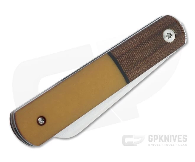 Handle: Traditional style executed with precision in a modern construction is the benchmark of a Pena custom. The clean straight lines of the Barlow pattern consist of thick titanium liners and antique paper Micarta scales with complementary black liners, long natural canvas Micarta bolsters, and a satin finished stainless steel shield inlay. Simple, smooth and rock solid, the liner lock delivers secure lockup for safe use.