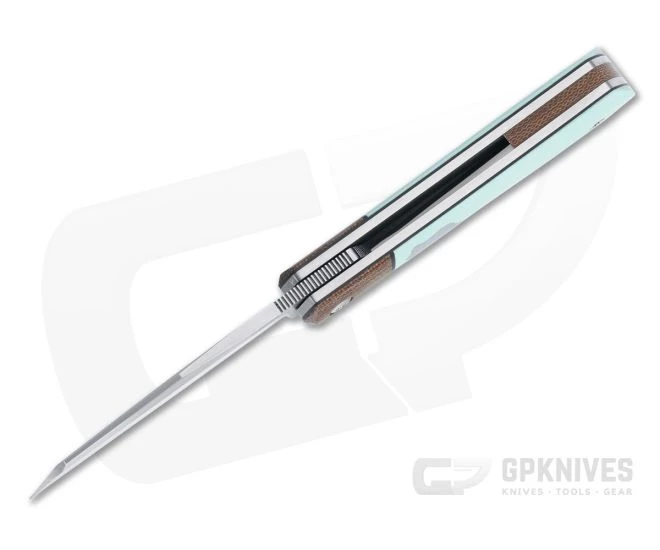 Handle: Traditional style executed with precision in a modern construction is the benchmark of a Pena custom. The sweeping modern lines of the Raptor are delivered with thick titanium liners supporting contoured Micarta covers over black liners. This piece comes with eye-catching Tiffany Blue G10 for the covers with brown canvas bolsters separated by the same black liner material and adorned with a satin finished stainless steel shield inlay on the front and matching Micarta partial back spacer. Simple, smooth and rock solid, the liner lock delivers secure lockup for safe use.
