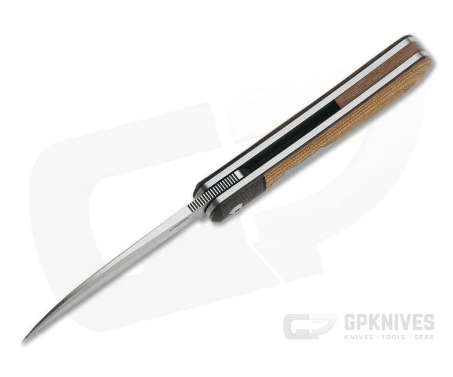 Handle:Â Modern and clean in form and function, the frame of the handle is formed by two thick satin finished titanium liners. These liners also form the liner locking mechanism which provides solid, secure lock up along with smooth operation. Giving the Swayback a timeless appearance, the scales and backspacer are made from Natural Canvas Micarta with cross-cut brown canvas Micarta bolsters all offset with black liner material. The knife is finished off with satin titanium hardware and a brushed stainless steel shield on the show side.