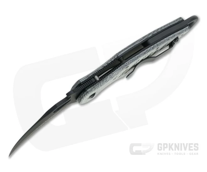 Handle: Constructed using full-length, skeletonized stainless steel liners the ergonomic scales are chamfered for comfort with finger grooves and thumb scoop for a solid grip. One liner forms the smooth, reliable and rock solid locking mechanism. A partial back spacer extends past the end of the handle to form a solid finger ring ensuring a place for every finger with any grip. This version has canvas Micarta scales which are rugged and durable offering traction even when wet and a warm in hand feel. Construction is rounded out with all black hardware.