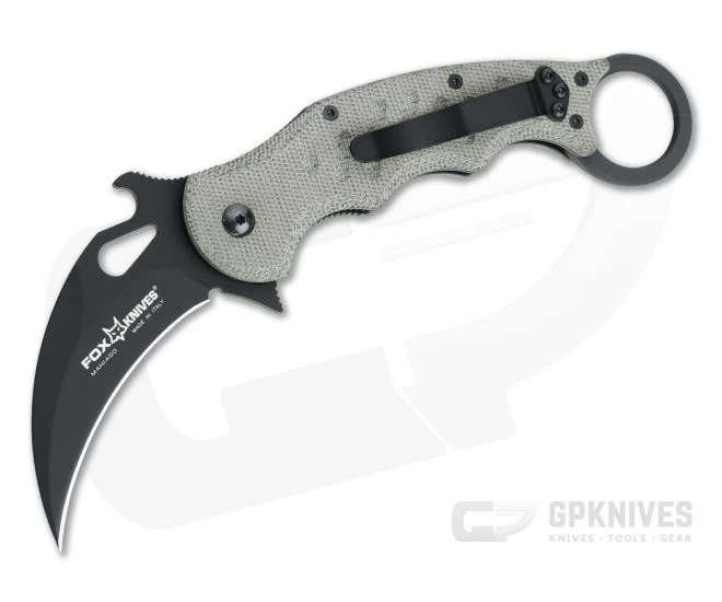 The Fox Knives 479 Karambit is a reliable tactical backup, liner lock folder with multiple deployment capabilities. Combining smooth action, an ergonomic handle and lightweight design the 479 Karambit from Fox is sure to be a favorite everyday carry for karambit enthusiasts everywhere. This version is upgraded with green canvas Micarta handles scales and a black coated N690Co blade.