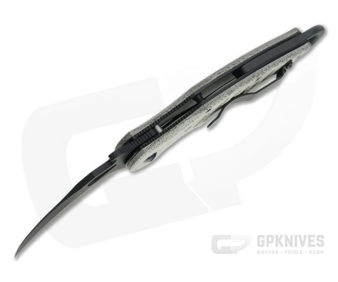 Handle: Constructed using full-length, skeletonized stainless steel liners the ergonomic scales are chamfered for comfort with finger grooves and thumb scoop for a solid grip. One liner forms the smooth, reliable and rock solid locking mechanism. A partial back spacer extends past the end of the handle to form a solid finger ring ensuring a place for every finger with any grip. This version has canvas Micarta scales which are rugged and durable offering traction even when wet and a warm in hand feel. Construction is rounded out with all black hardware.