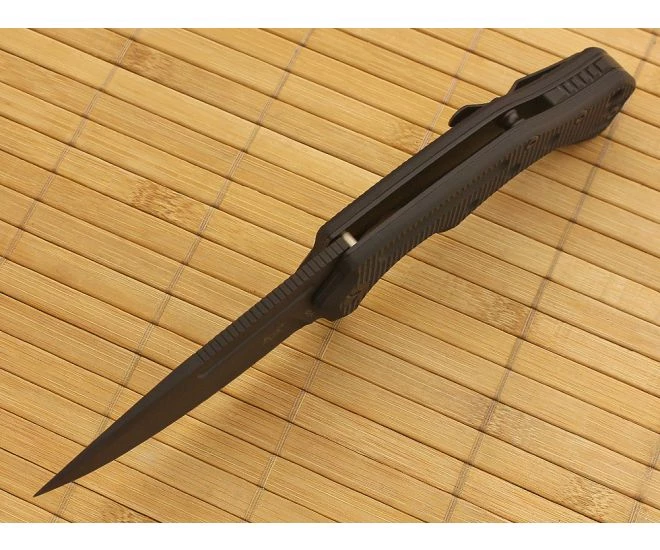 The Blade: Over 3.5 inches of razor sharp N690Co Cobalt Vanadium high quality stainless steel to slice and pierce through whatever’s in your way. It’s a big-bellied drop point with slight upper swedge grind and lengthy jimped thumb ramp. The length could come in handy on finer cutting tasks such as skinning in the field. A blood groove cut into each side lightens the load and ups the cool factor. It flies smooth as silk out of the handle via an integral flipper tab. Easy, no-wrist necessary flipping here. It makes a great finger guard when open to boot. The finish is a Black Cerakote™ based on Nano-Ceramics which is super corrosion, abrasion, wear and water resistant. It’s also non-reflective to keep your position concealed.