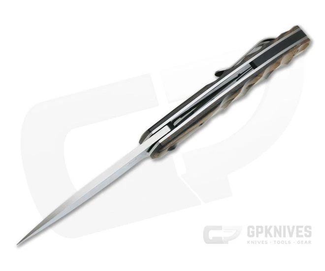 Handle: Thick, Anso-pattern milled Ziricote wood handle scales are supported by solid stainless steel liners offering a full and comfortable grip with plenty of traction for a secure grip. A non-milled section near the pivot creates a faux bolster look for added style. The rear liner forms the locking mechanism for secure use and solid operation. A generous hole is provided for lanyard attachment while a partial G10 back spacer helps protect the edge when closed. Zippered nylon storage pouch included.